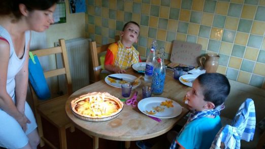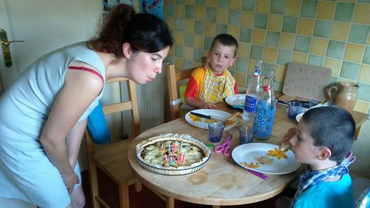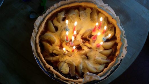 Et puis le jour J, chez nous, juste entre nous quatre. Il faisait tellement chaud que j’ai opté pour une tarte aux poires et au chocolat. C’était à la fois gourmand et rafraîchissant.