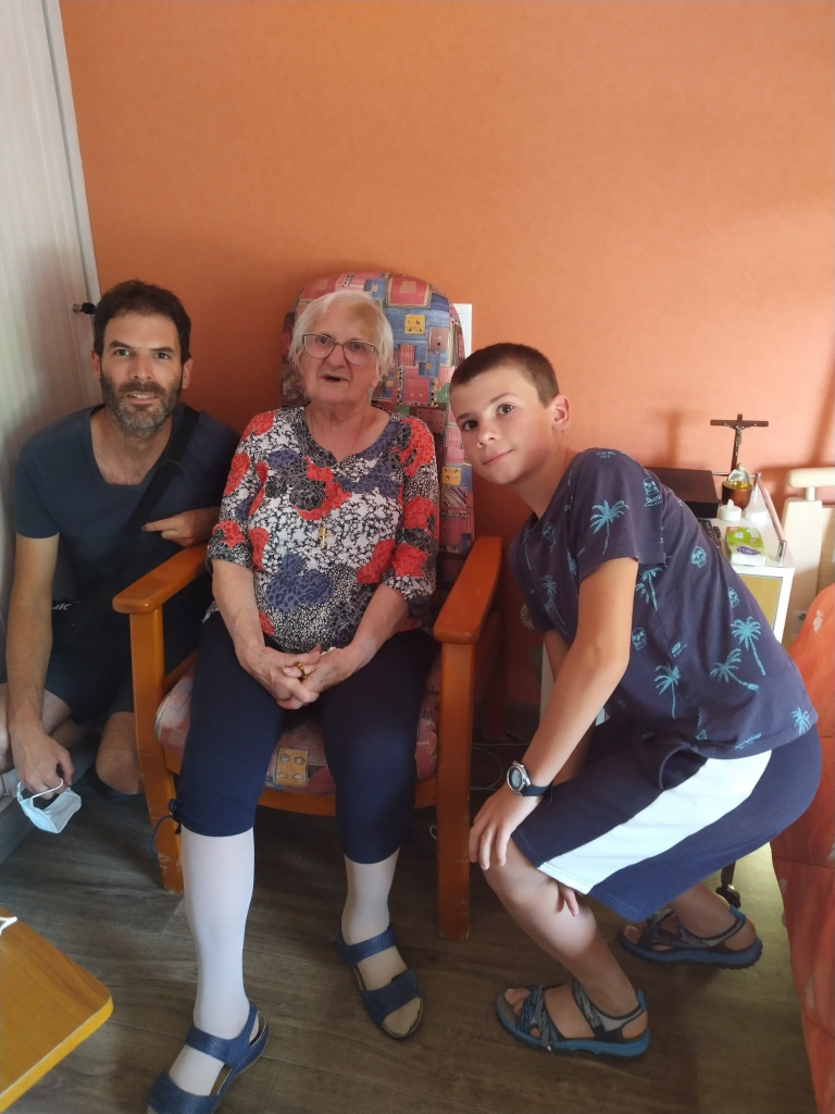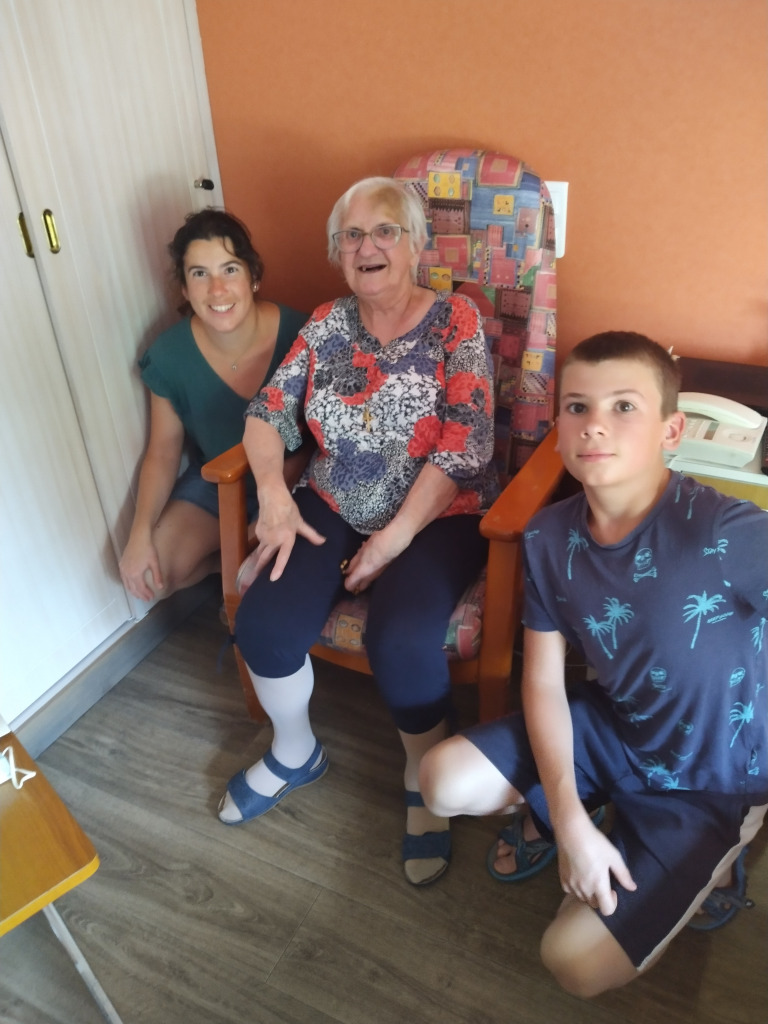 Étant à environ 30 kilomètres de l’EHPAD où se trouve la grande tante de JC, nous sommes partis la voir après le repas. Sur la route, nous avons fait une visite surprise à Aline, la cousine de Jean-Christophe, puisqu’elle se trouvait chez elle quand nous sommes passés.
