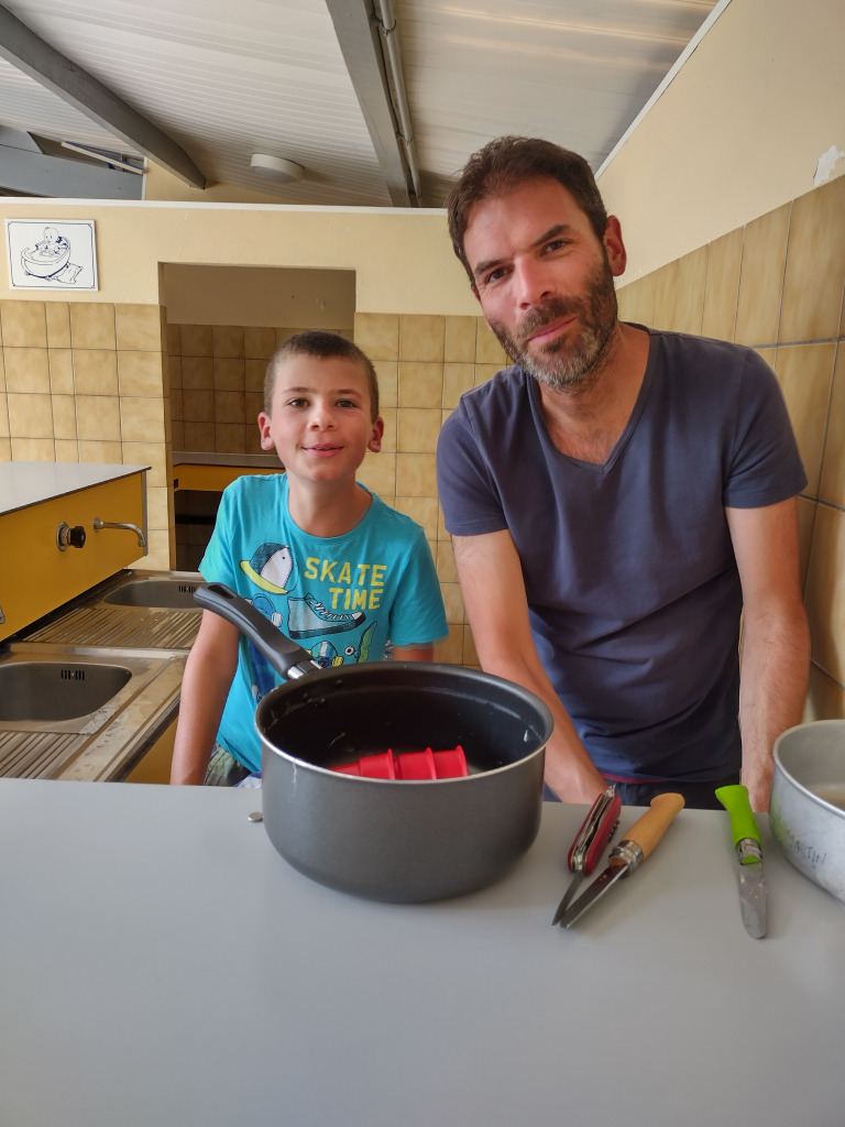 Repas de « dingue » d’après Nathanaël. Au menu, pâtes/jambon/fromage râpé – pain et fromage – crème Mont blanc au caramel. Le bonheur total !