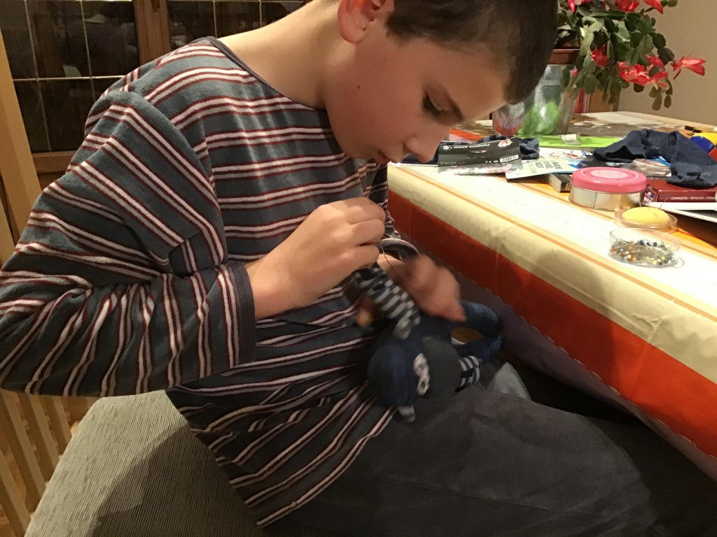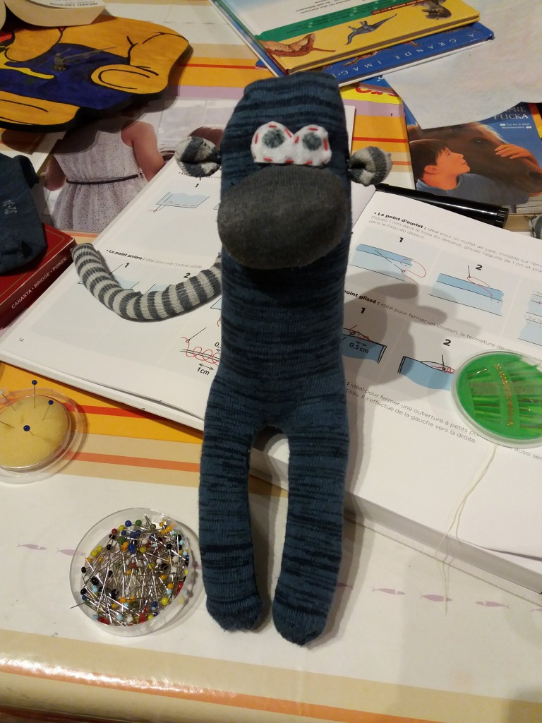 Nathanaël a appris le point arrière, le point avant, et le point glissé. Mis à part, les oreilles, les yeux et le museau, Nathanaël a tout cousu. Bravo.