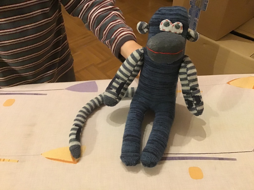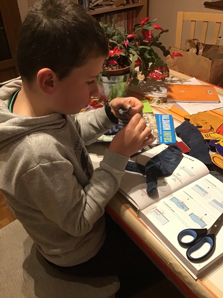 Nathanaël a commencé hier soir un doudou avec des chaussettes orphelines. Ce soir, Charles est fini.