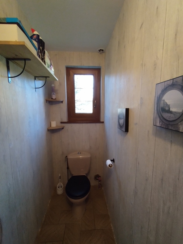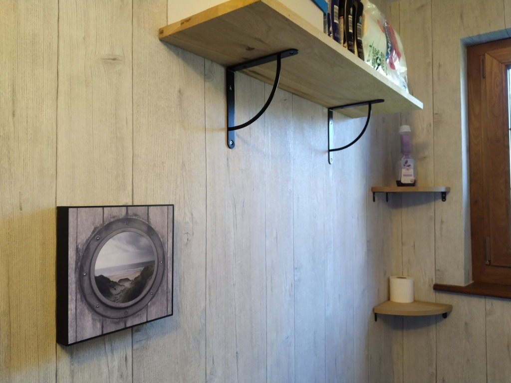 Jean-Christophe a fini l’aménagement des toilettes. Toutes les étagères sont posées, le dérouleur de papier est fixé et un nouvel abattant est arrivé. Il ne manque plus que le sol, mais ça, ce sera pour après.