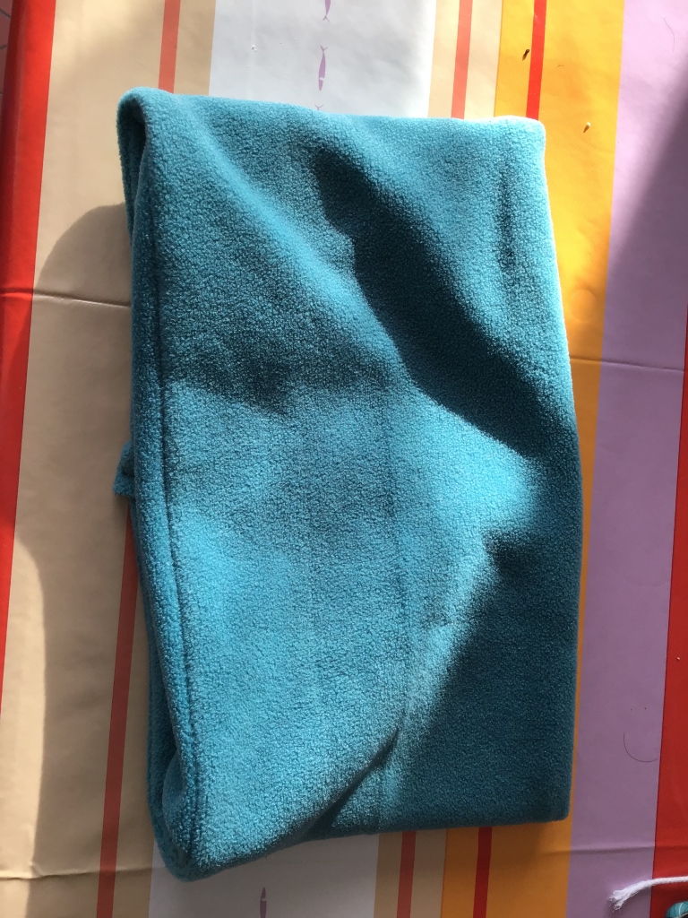 Les températures annoncées cette semaine sont assez froides. Les enfants n’ayant toujours pas le droit aux écharpes à l’école, j’ai transformé une écharpe en polaire appartenant à Jean-Christophe en tour de cou pour Nathanaël.