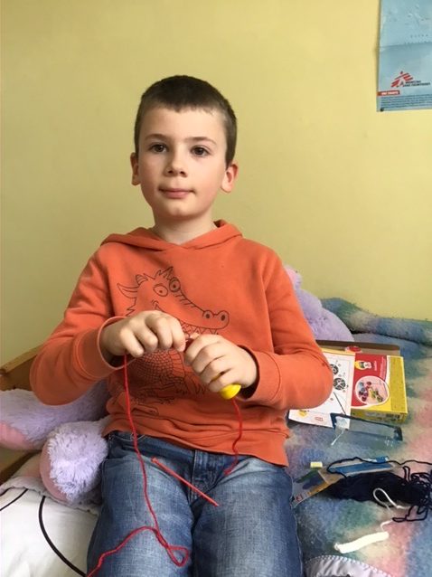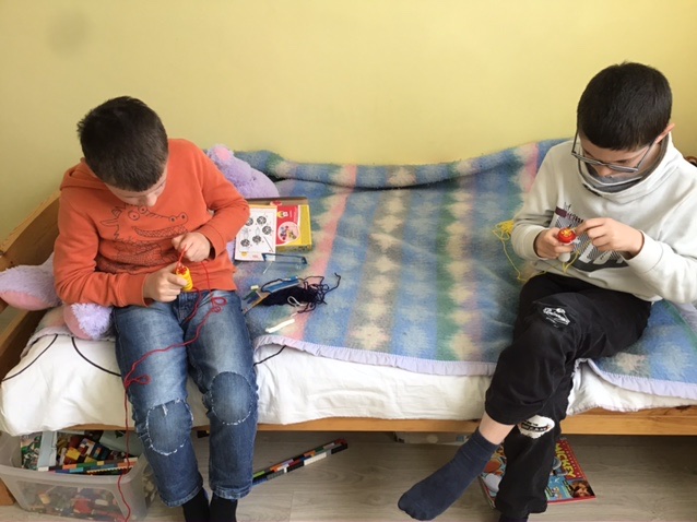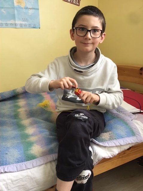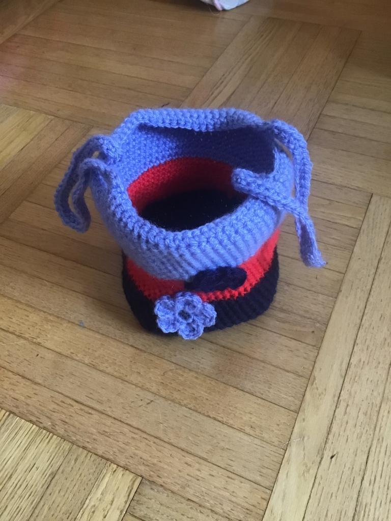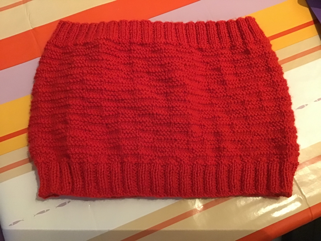 Le mois dernier, je me suis lancée dans le projet de tricoter un tour de cou à Samuel. J’ai eu quelques difficultés, notamment lorsque j’ai oublié de changer de point dans un rang. Ne sachant pas très bien détricoter des mailles, j’en ai perdu deux. J’ai été en colère après moi. Après une heure de recherche, j’ai trouvé une vidéo me montrant comment rattraper des mailles, et je suis allée me coucher. Le lendemain, pendant la sieste des petits que je garde, j’ai tenté la récupération de mes mailles perdues, le soucis étant de les récupérer… dans le bon sens en fonction des points tricotés dans les rangs. Bon, j’ai galéré, ça a fait un petit pâté, mais j’avais à nouveau mes deux mailles. J’ai appris ensuite grâce à une vidéo à détricoter un rang, car j’avais encore fait des bêtises. Samedi, j’ai fini le tour de cou, après l’avoir resserré car « légèrement » trop grand pour le cou de Samuel. Voici le résultat :