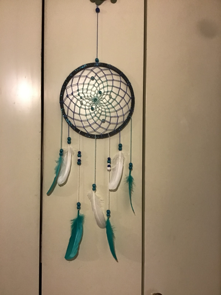 Jean-Christophe a fini d’ouvrir ses cadeaux. Comme il dort assez mal depuis pas mal de temps, je lui ai fait un attrape-rêve. À voir si c’est efficace.