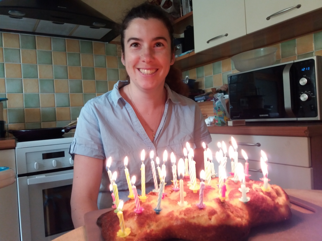 Ça y est, pour un peu moins de trois mois, j’ai le même âge que mon mari. Et parce qu’à 32 ans nous avons toujours besoin d’un nounours, je me suis fait un gâteau nounours à l’abricot. Miam !