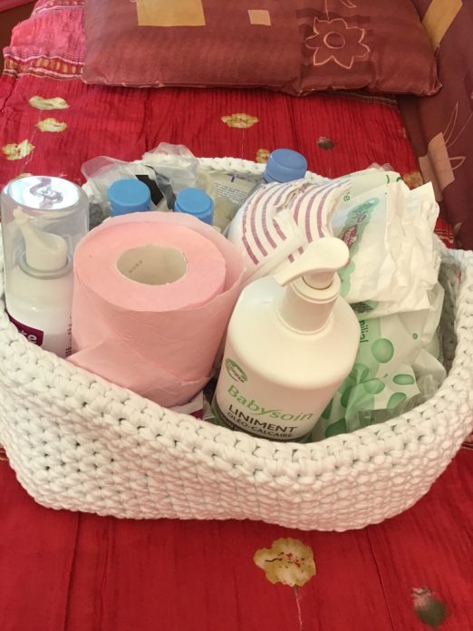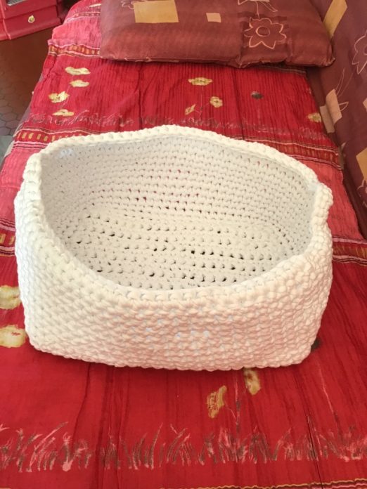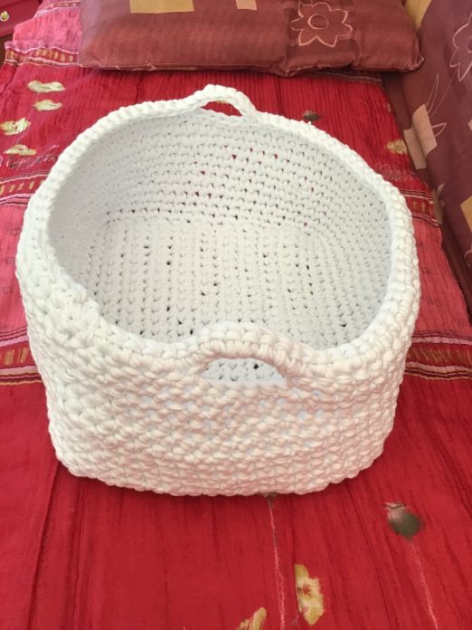 La corbeille en plastique, contenant toutes les affaires de changes des petits que je garde, tombait en miettes. J’ai donc fabriqué ma première corbeille rectangulaire au crochet. Le plus, je lui ai fait des poignées. J’en suis assez fière.
