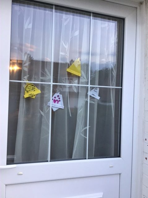Katty, la responsable du catéchisme a proposé aux enfants de faire des cloches en origami et de les accrocher à la porte aujourd’hui.