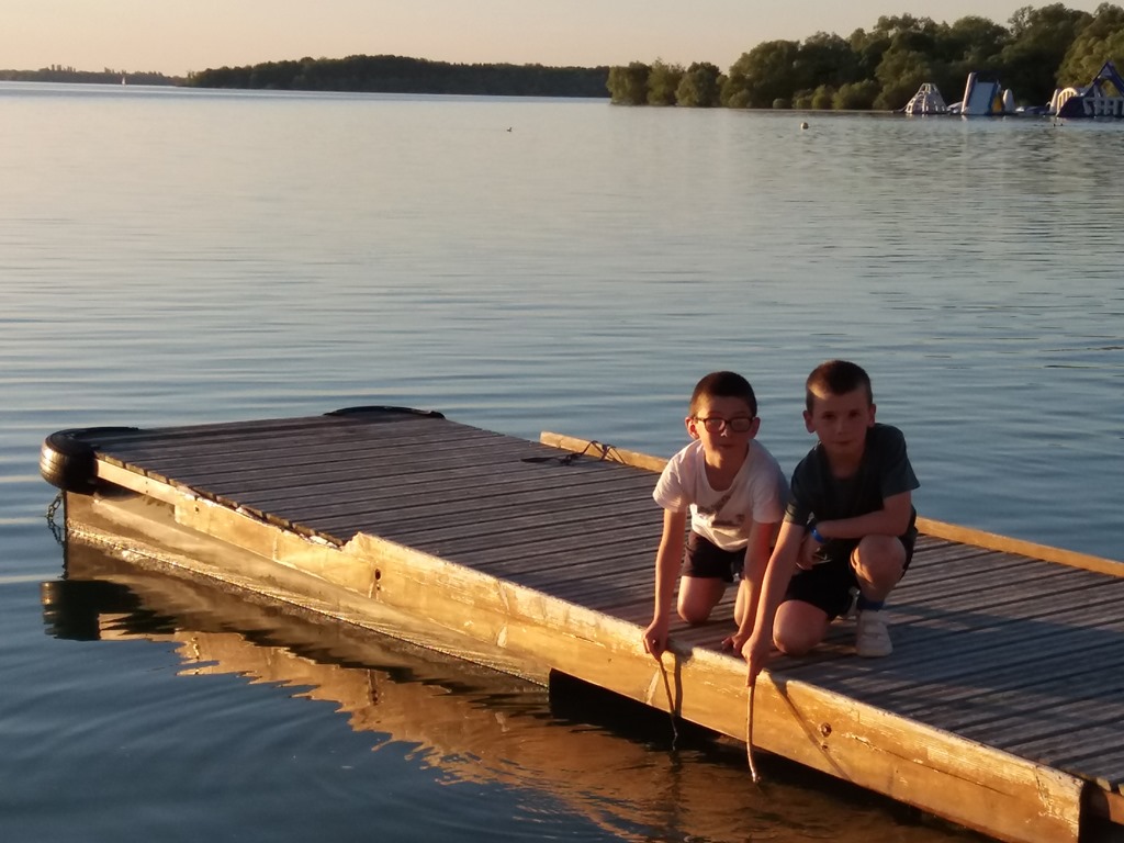 Après le repas, les enfants sont allés faire une course d’orientation organisé par l’animation du camping, ils ont gagné trois sucettes chacun, ils étaient ravis. Ensuite, jeux de plage pendant que JC et moi allions courageusement nager dans le lac. Je pense que la température de l’eau ne devait pas dépasser les 17°C. Nous avons retrouvé la piscine du camping qui était très peu peuplée en cette fin d’après-midi. Ensuite, nous nous sommes accordés une partie de badminton en amoureux.