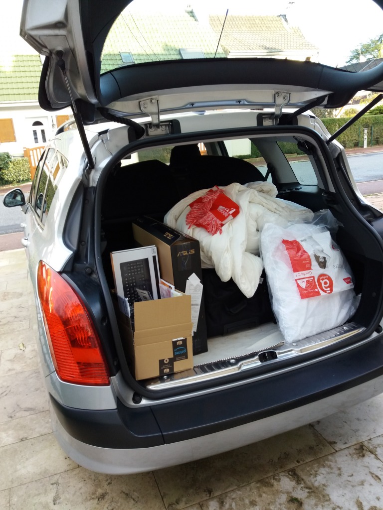 Le coffre un peu chargé, lui, et bien c’est parce qu’il va bien falloir survivre pendant 8 mois ! A manger, une couette, des draps, des vêtements, des chaînes (oui, il neige pas loin !), et… un vieil ordi que j’ai ressuscité ce week-end.