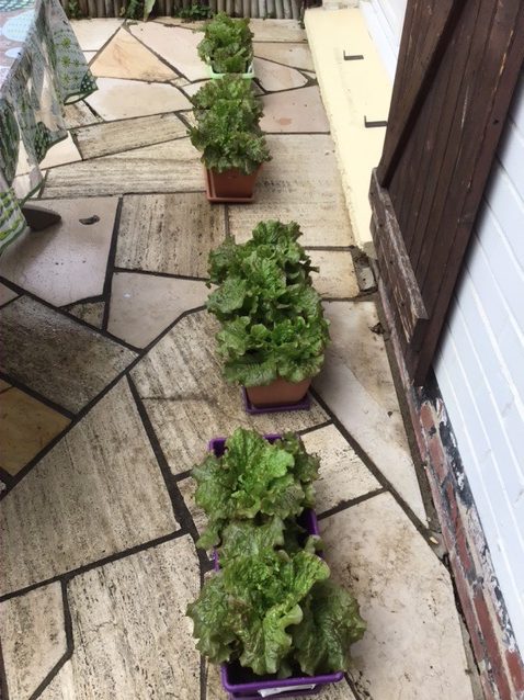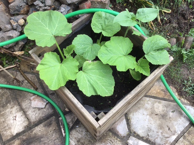 Dans le potager du fond, il y a un pied de tomates et un pied de courgettes.
