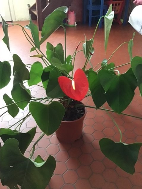 Et puis ensuite, Jean-Christophe avait eu une plante pour ses 30 ans. En Janvier, quand la puéricultrice m’a rendu visite, elle m’a signalé que celle-ci était toxique et que du coup, il fallait qu’elle soit en hauteur. Pas de problème, nous l’avons mis au dessus du living. Et bien ça lui a plu à la demoiselle. Alors qu’elle n’avait jamais refleuri, la hauteur lui a fait du bien :