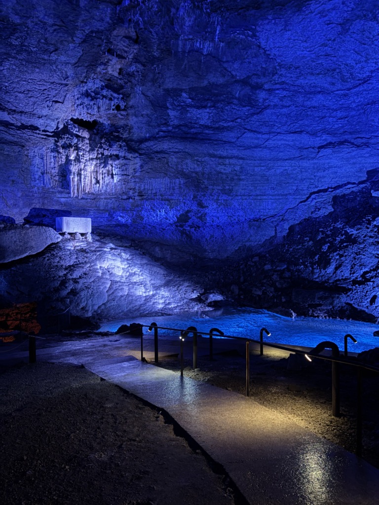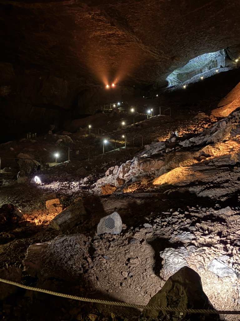 Donc c’est un gouffre… Plutôt impressionnant, avec ses plus de 150 marches raides à descendre pour accéder au bas de la doline et ses 100 autres marches pour descendre au fond et faire le tour de la salle souterraine, à 7°C.