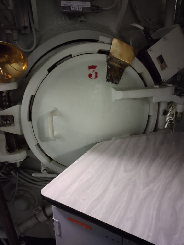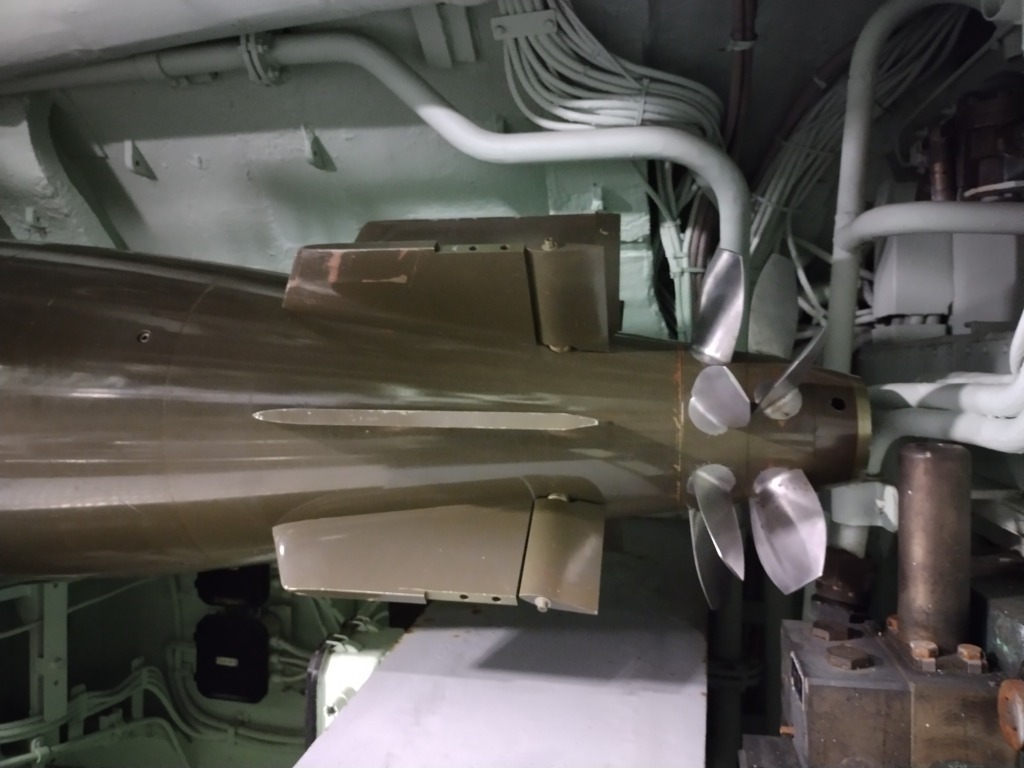 Les cornets pour communiquer avec le pont supérieur ou inférieur Un des 16 tube de missileLa lumière rouge qui permet de simuler la nuit dans le sous-marin Chambre dans le carré des officiers Le salon des officiers On descend dans la cuisine et la cantineCabine de l’équipageL’hôpital Les torpilles Les torpilles Les tubes lance-torpilles