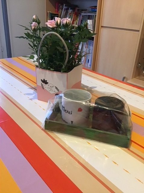 La semaine dernière, nous les avons invité à prendre l’apéro et ils sont arrivés avec les bras chargés de cadeaux. Un rosier, une tasse, de la confiture, des gâteaux.