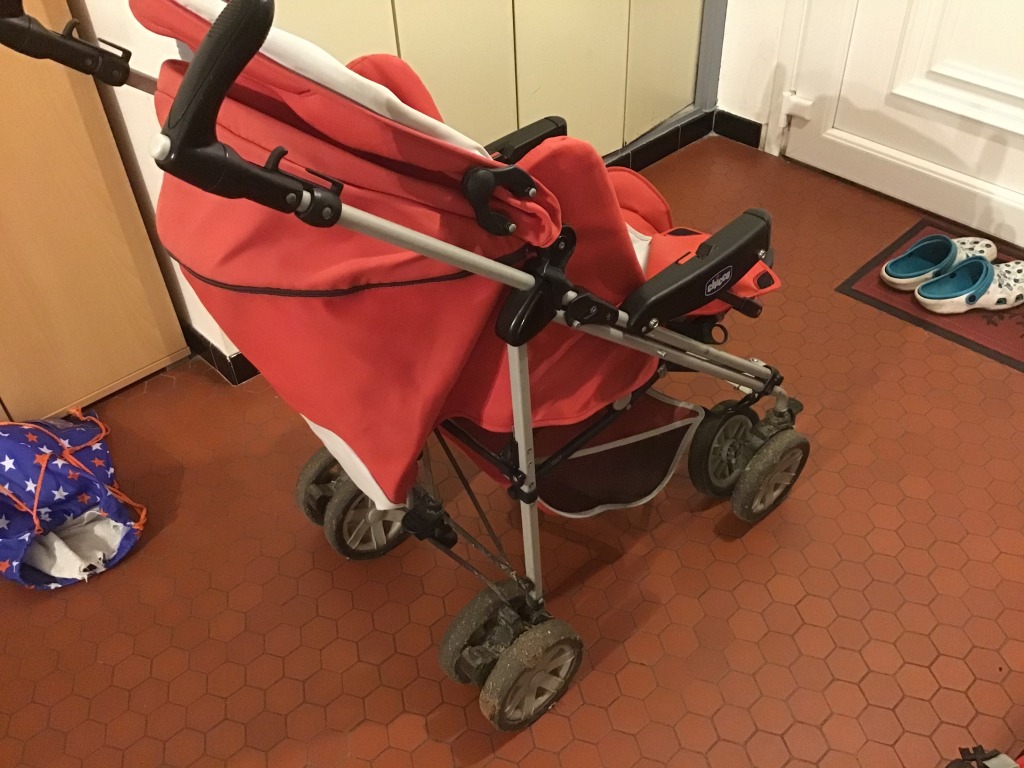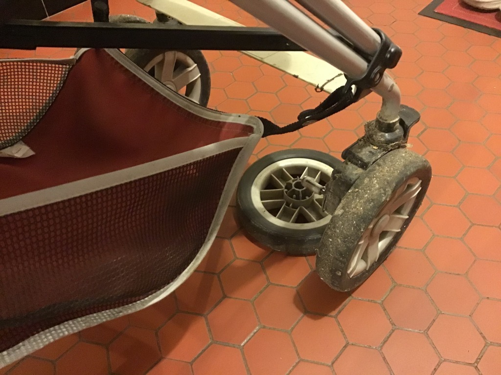Après dix ans et demi de bons et loyaux services, la belle poussette rouge a rendu l’âme hier en perdant sa roue avant.