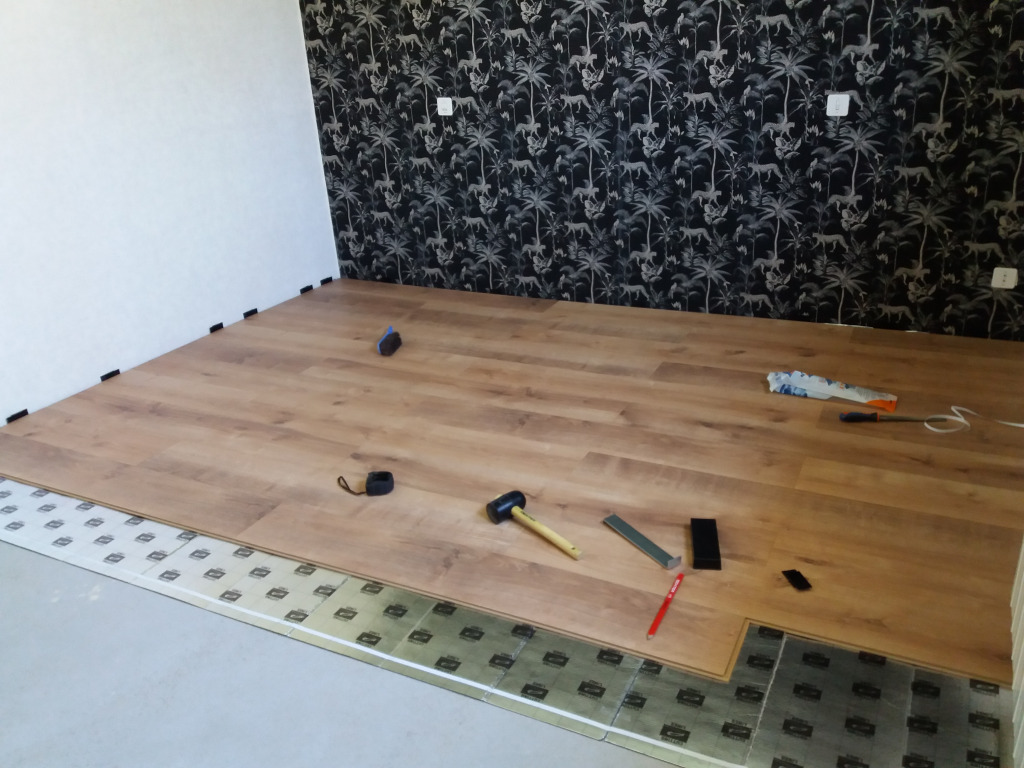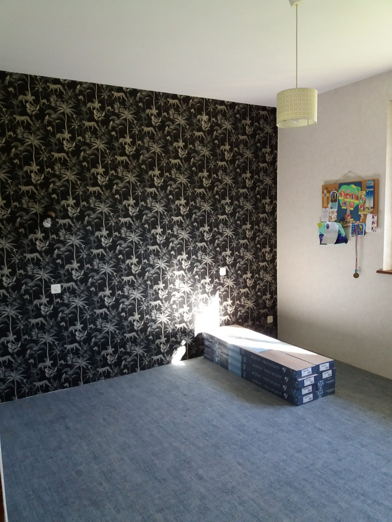 Voici les photos du jour quand la moquette était encore présente et en cours de pose du parquet.