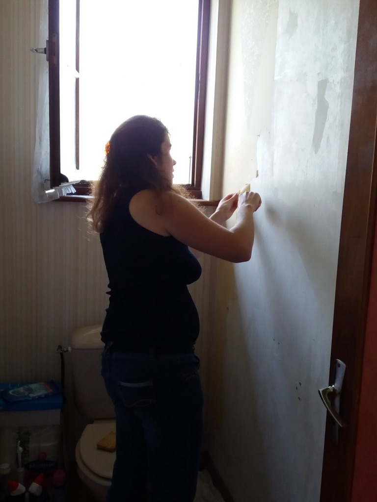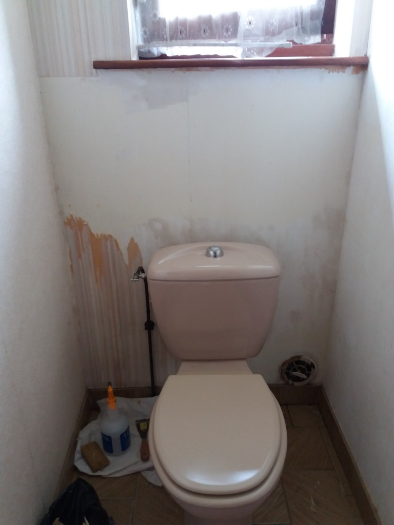 Le décollage du papier peint des WC est quasiment terminé. Nous allons pouvoir commencer le vol à destination de nos nouveaux toilettes.