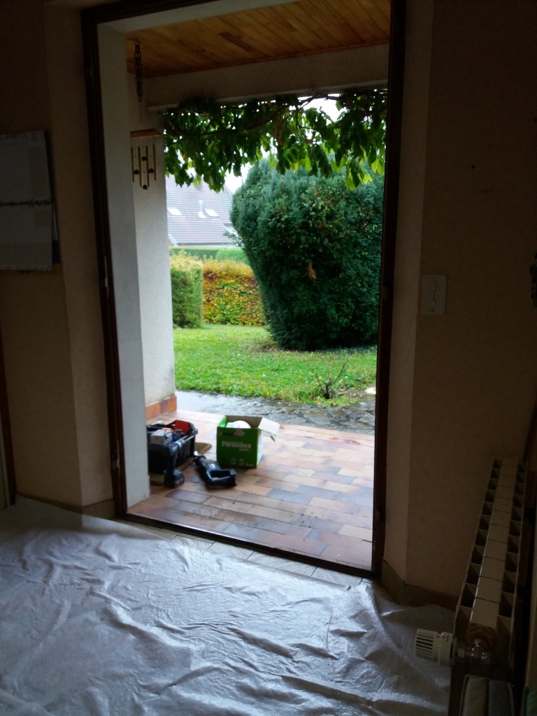 C’était sensé être la dernière photo de notre vieille porte d’entrée, mais à l’usine, ils se sont planté et n’ont pas reporté les bonnes mesures. Heureusement, le poseur avait juste dégondé la porte, et après avoir remesuré, il s’est aperçu que la porte n’était pas aux bonnes dimensions, il a remis l’ancienne porte en place.