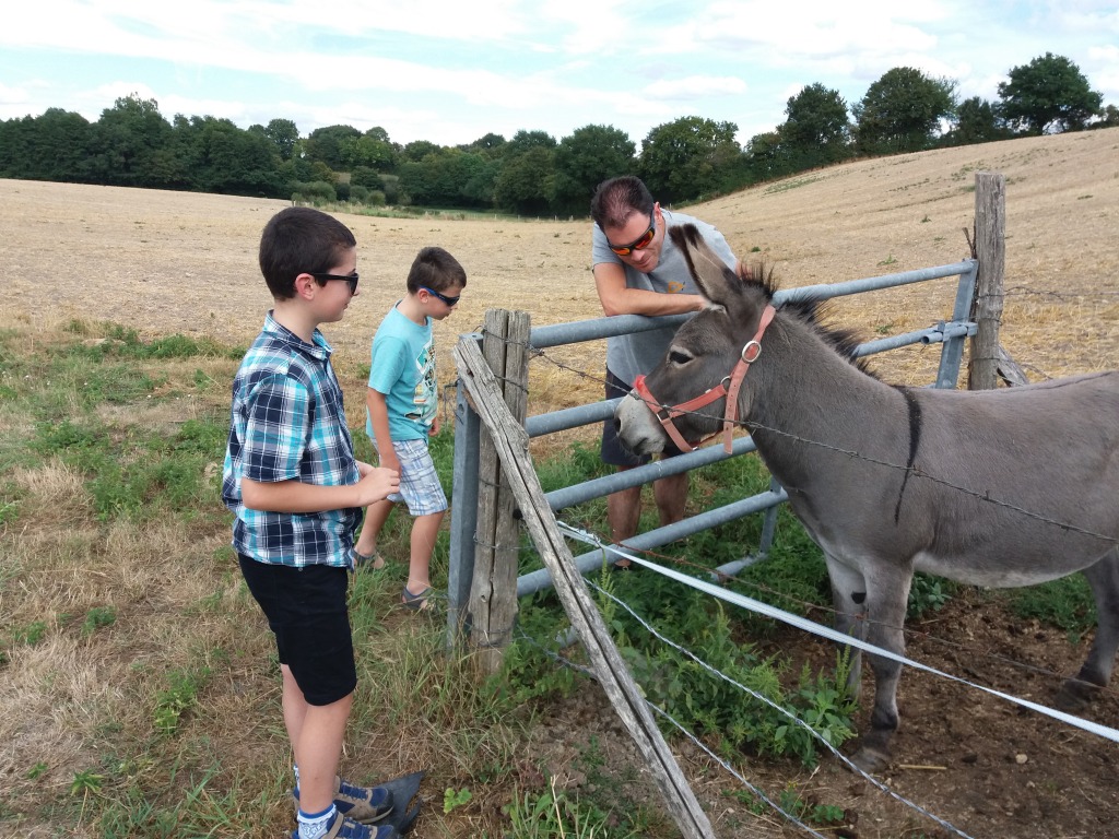 Notre gîte se situe à la campagne, au bout d’une route, au bout du monde… la propriétaire possède au mois quinze poules et un coq, ainsi qu’un âne.