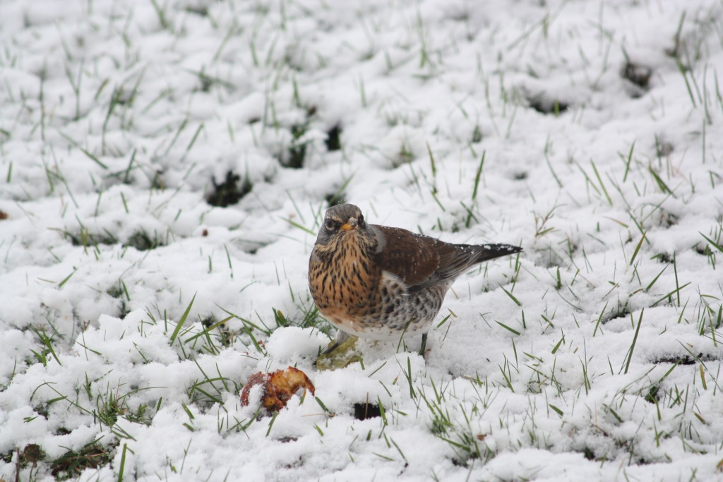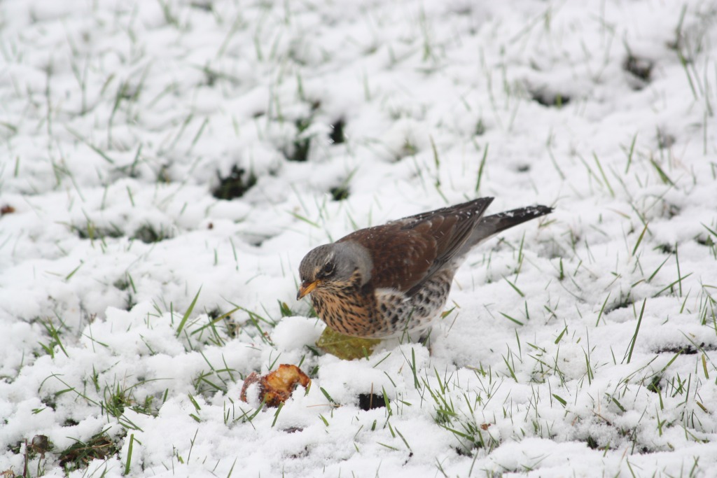 Ce matin, Jean-Christophe a immortalisé une grive qui a trouvé une vieille pomme sous le pommier.