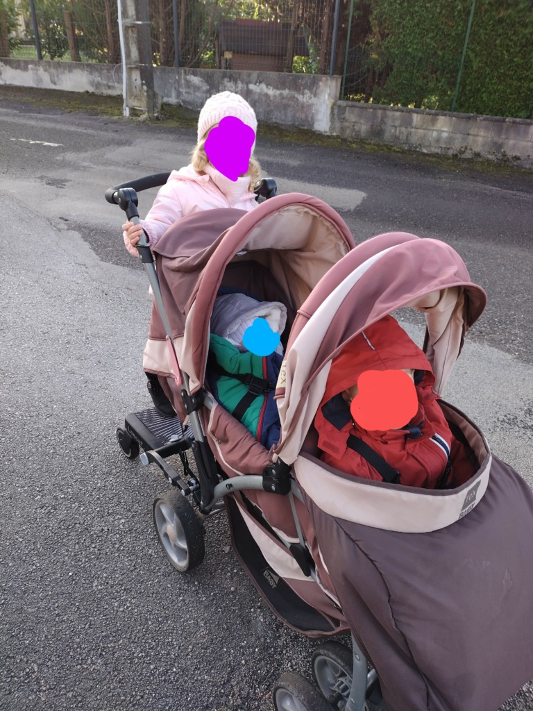 Voilà, Ayden a dormi en poussette, Aaron n’a pas changé ses habitudes et Ève était contente d’être grande derrière la poussette.