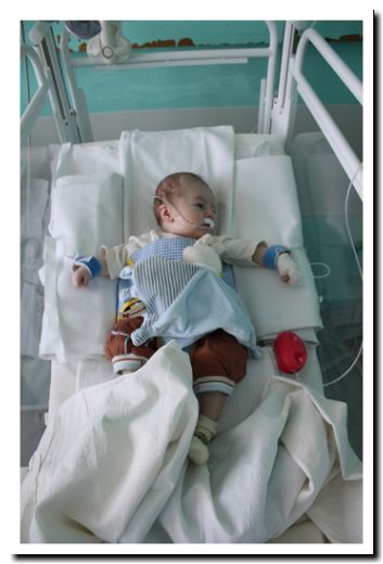 On t’aime mon petit Lapin. On est avec toi ! On notera sur la première photo les 2 menottes qui l’emprisonnent (et qui le gênent) pour l’empêcher d’arracher la sonde…
