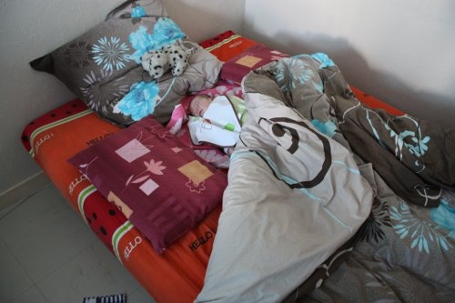 Après une « bonne nuit », c’est-à-dire un réveil en pleurs vers 6h30, Samuel a changé sa couche, et a pris son petit déjeuner. En temps normal, après ce rituel, bonhomme se rendort aussitôt. Mais aujourd’hui, M. Chenapan en a décidé autrement et s’est mis à crier dès lors qu’il était recouché. Après quelques minutes à esssayer de le mettre sur OFF, nous avons décidé de le renourrir un peu, dans notre lit (c’est-à-dire sur le clic-clac) pour faciliter la tâche de maman. Après quelques bonnes gorgées, il s’est rendormi, jusqu’à 10h… Bien joué M. Ouin-Ouin !
