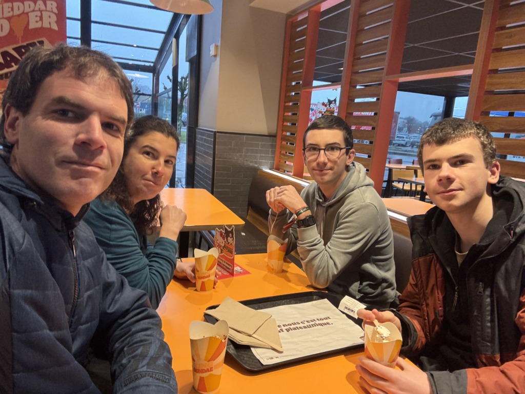 Les plus futés de nos milliers de lecteurs se diront « mais pourquoi ne pas être rentrés après Luna Park ? ». Effectivement ! Simplement parce que Julie et moi avions une soirée prévue à Besançon à 19h30 et avions besoin de la voiture pour rentrer le soir. Les garçons devaient rentrer avec le « premier » train… à 18h39 ! Nous les avons donc emmenés à la gare, et avons attendu le départ du train. Ils sont remontés, ils ont mangé une pizza devant la télé. Fin de l’histoire pour eux.