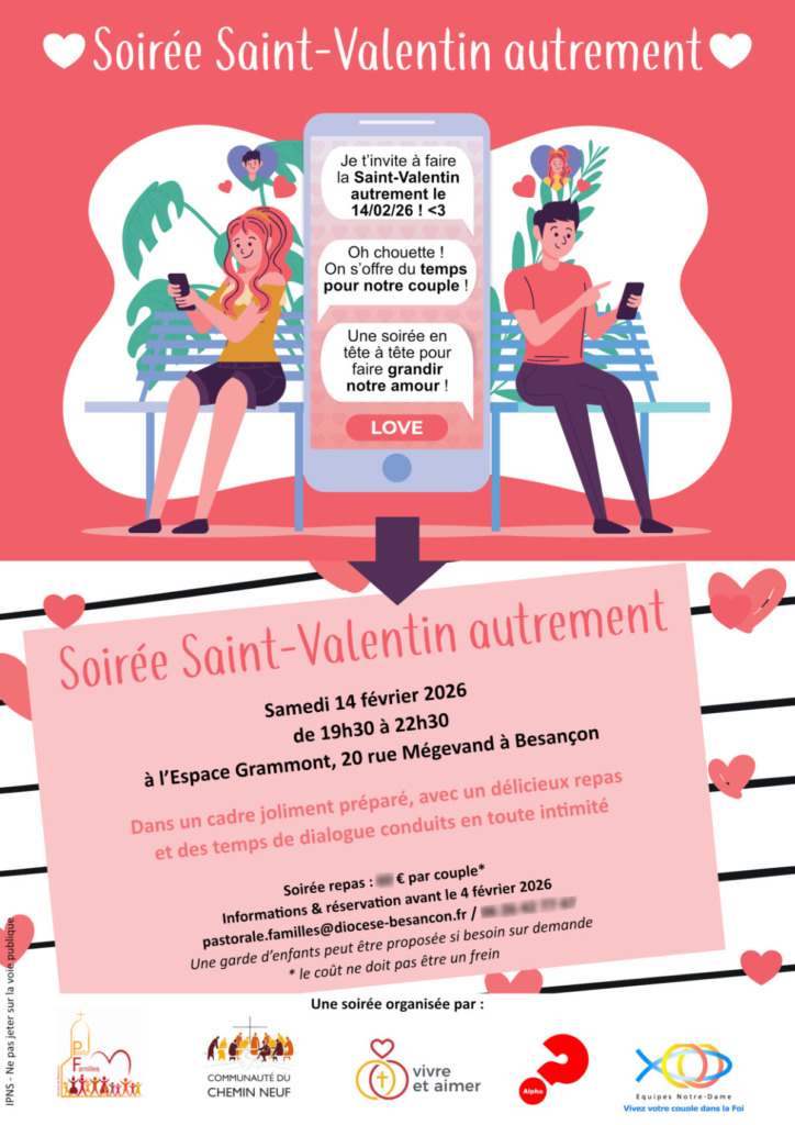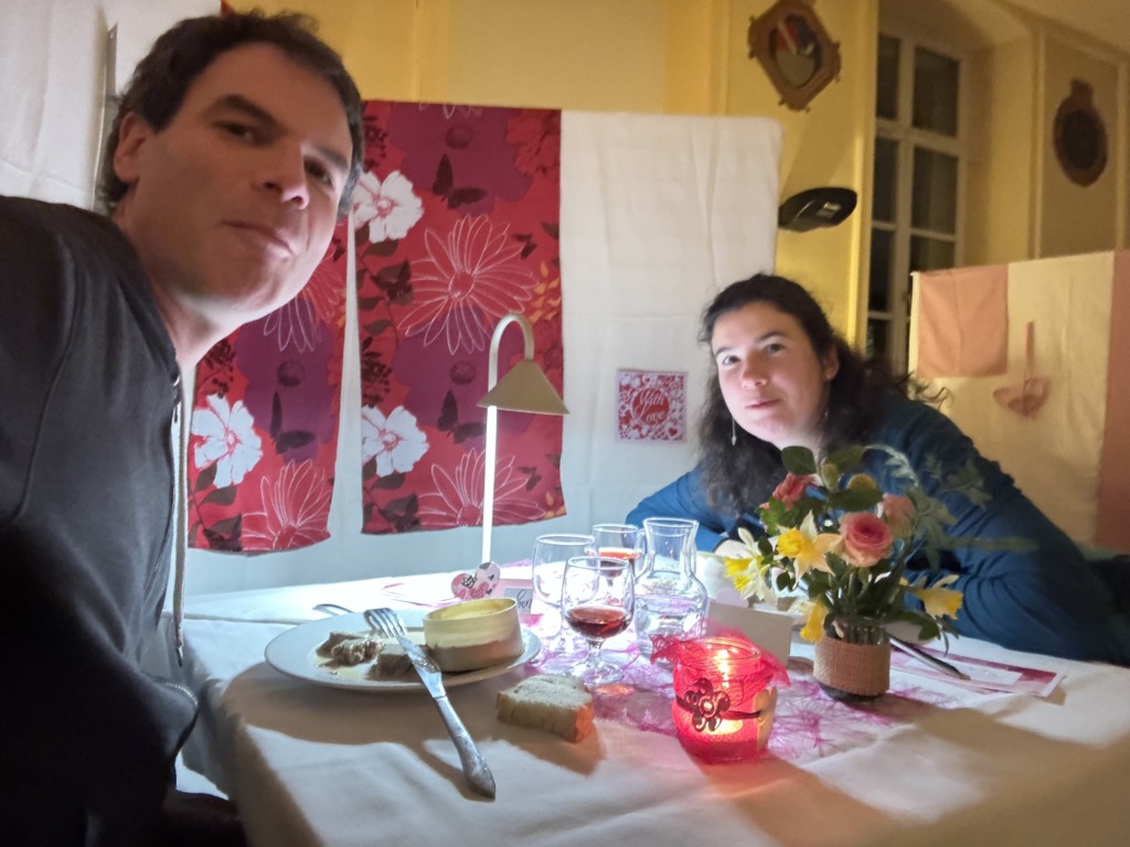 Notre soirée à présent… Le diocèse organisait, par l’intermédiaire de diverses organisations, une soirée « St Valentin autrement ». Après un « accueil – apéritif » où nous avons retrouvé des têtes connues, nous avons été installés dans une salle joliment décorée dans une ambiance « love – tendresse », sur des tables individuelles. Après une activité « création de composition florale » pour les messieurs et « poèmes » pour les dames, nous avons dîné, en continuant à discuter autour de questions, à parler de nous, à penser à notre couple, le tout toujours dirigé par des petites activités vraiment bien ficelées. Un moment utile, intime, régénérant. On a bien ri, on a vraiment passé un chouette moment. On recommande !