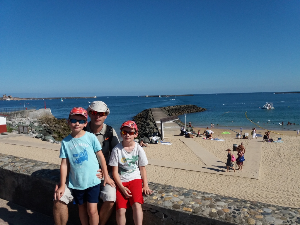 La marée était basse et il y avait beaucoup de « gros » cailloux qui nous roulait sur les pieds et les jambes quand nous voulions rentrer dans l’eau, ce n’était pas très agréable. JC a pris beaucoup de plaisir à nager dans les vagues, Samuel s’est amusé sur le bord car les vagues étaient tout de même assez fortes et que j’avais peur qu’il soit entraîné au large, et Nathou a aussi joué au bord dans le sable et l’eau. Ce jour là, le sable était brûlant.