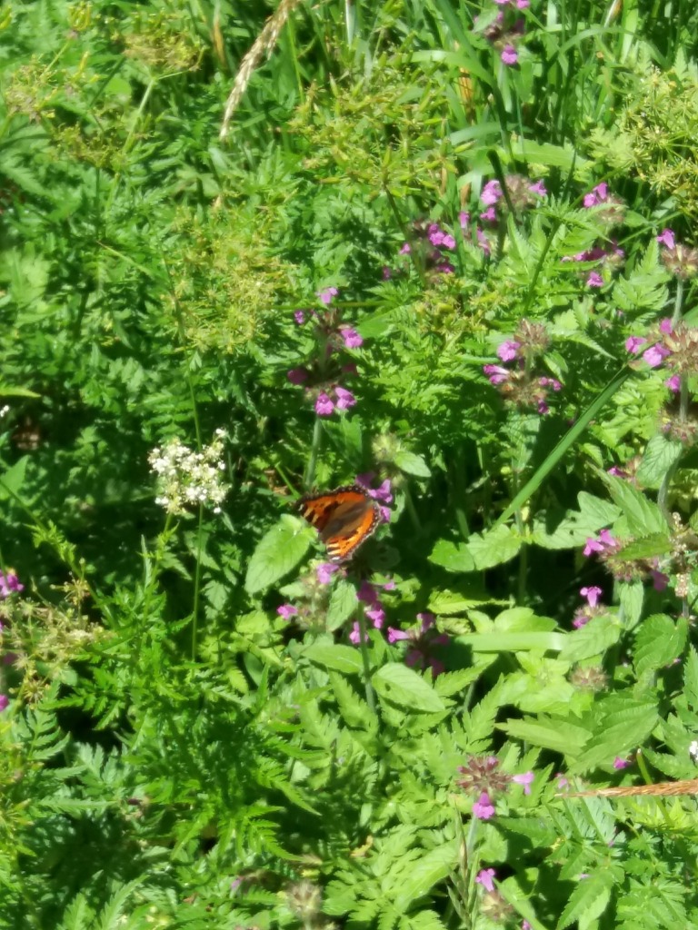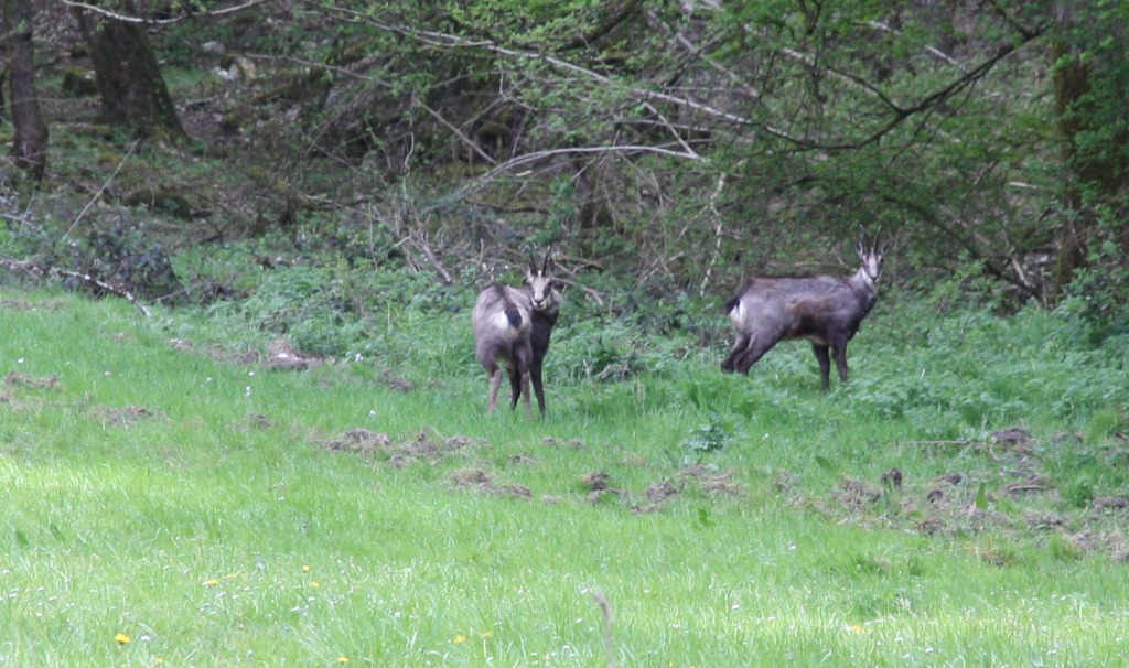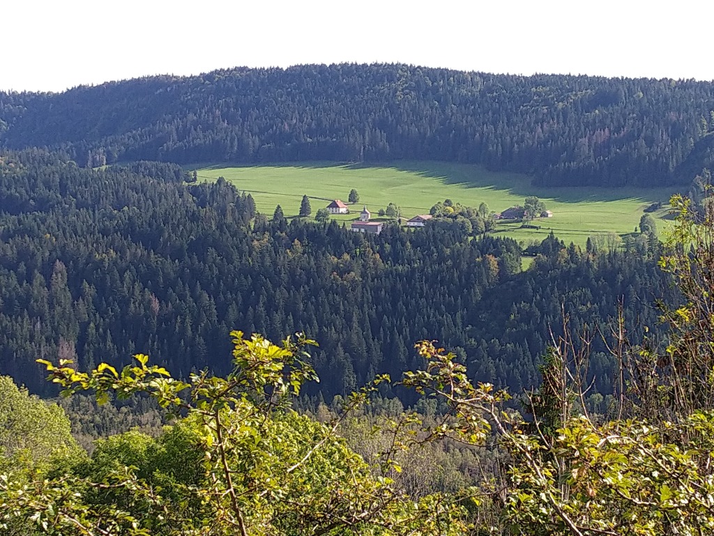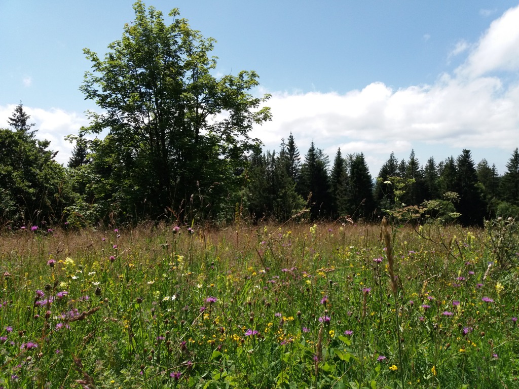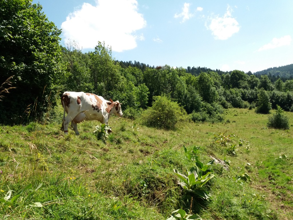 Mais continuons notre rando ! Lors d’une intersection, nous avons eu la mauvaise surprise de trouver notre chemin barré par un arrêté préfectoral pour cause de « grave danger de chutes d’arbres par dépérissement forestier ». Rien que ça… Héroïquement, j’ai décidé de braver l’interdiction. On s’est retrouvé rapidement au milieu d’un labyrinthe quasi impraticable, nous obligeant à slalomer à moitié courbés entre les sapins couchés, les branches et les arbustes. Les mollets égratignés de Nathanaël peuvent le confirmer. Enfin, nous sommes sortis de cet enfer pour nous retrouver dans une jolie prairie, au Gresson.