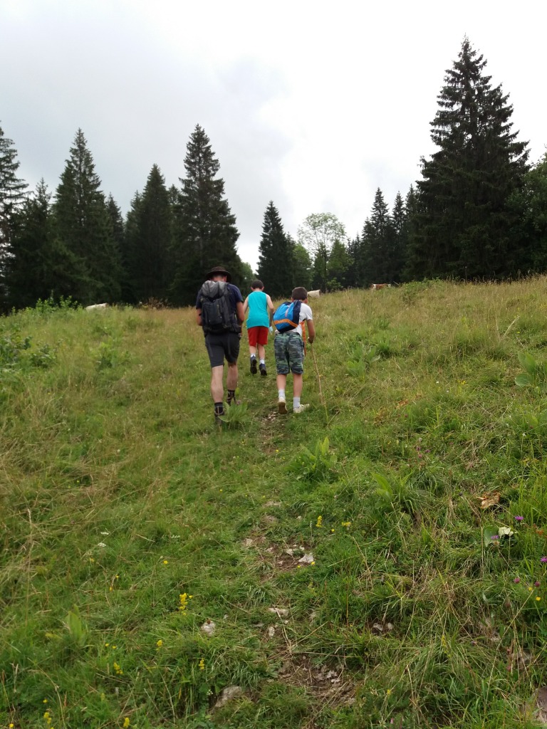 Après ce temps de repos sous un soleil assez chaud, nous avons entamé la suite de la randonnée, avec un sentier qui grimpait sans vraiment vouloir arriver en haut de la montagne. Samuel a fini par ronchonner, mais après une courte négociation, il est redevenu bien sage. Enfin, nous sommes retombés au lac des Perches, que nous avions vu d’en haut le matin.