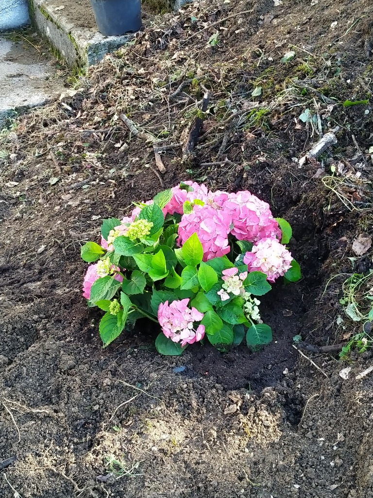 La semaine dernière, Jean-Christophe avait fait de la place en enlevant un buisson énorme. C’était pour mettre à la place un hortensia. Il n’y aura pas que ça à terme, mais là, c’était la bonne période pour en planter un.