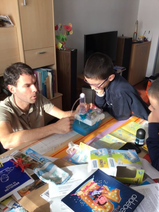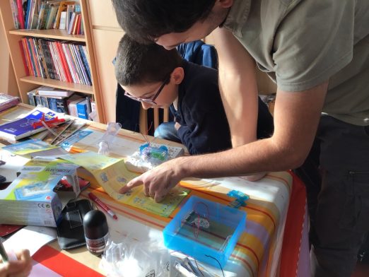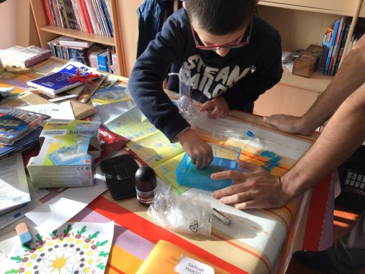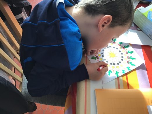 Nous sommes tous les quatre, pour une fois, ce n’est pas la course pour les activités en tout genre, alors nous profitons de cette matinée calme. Nathanaël fait un mandala.